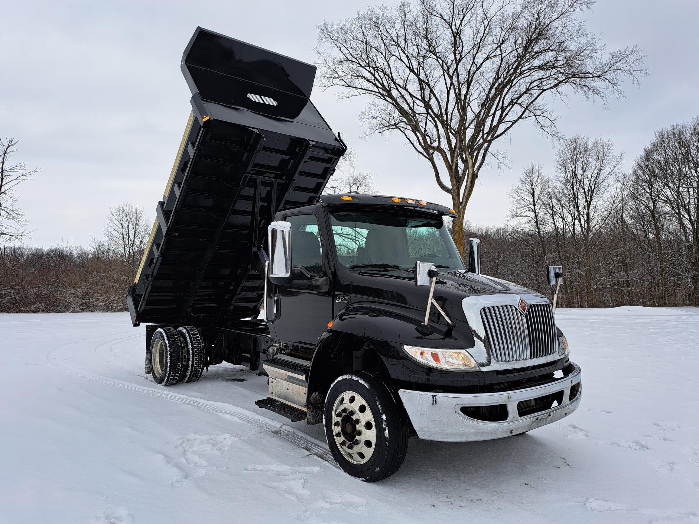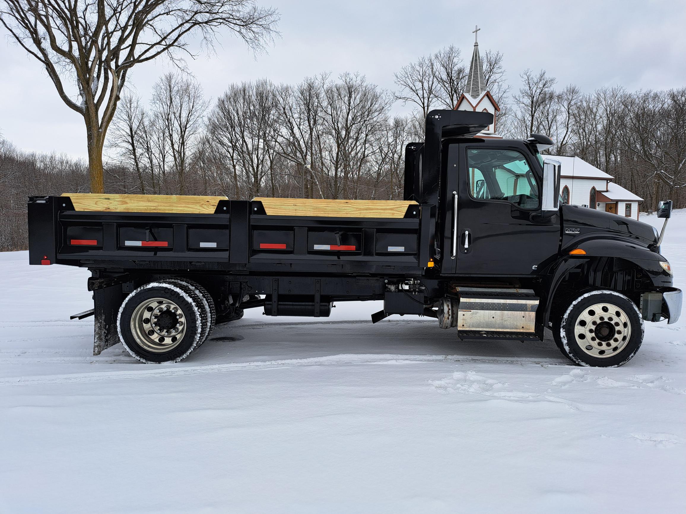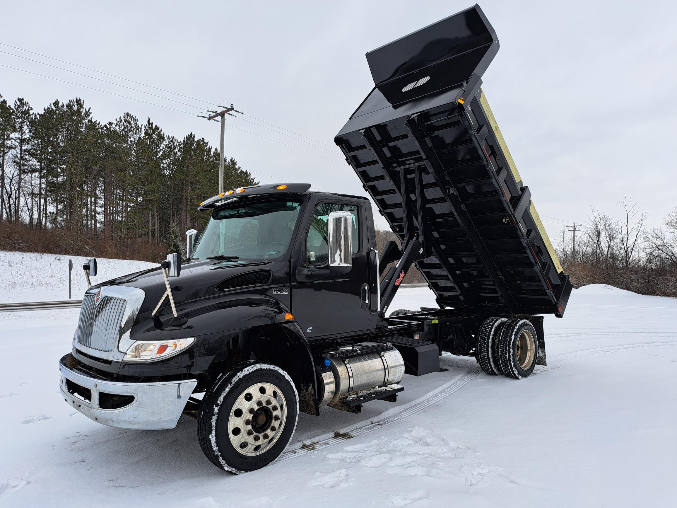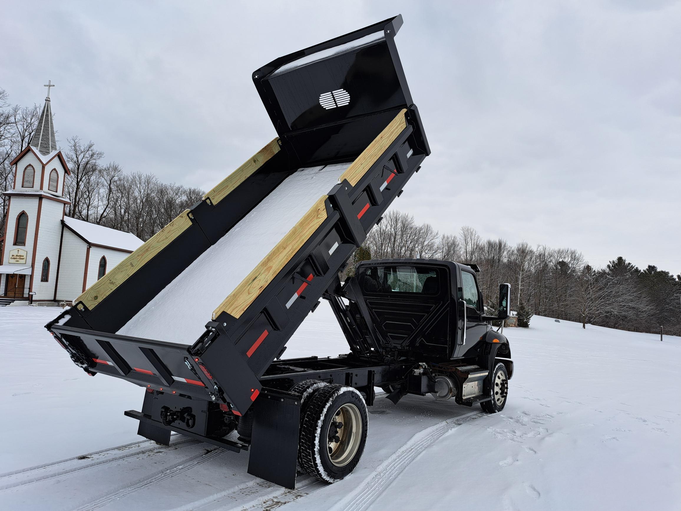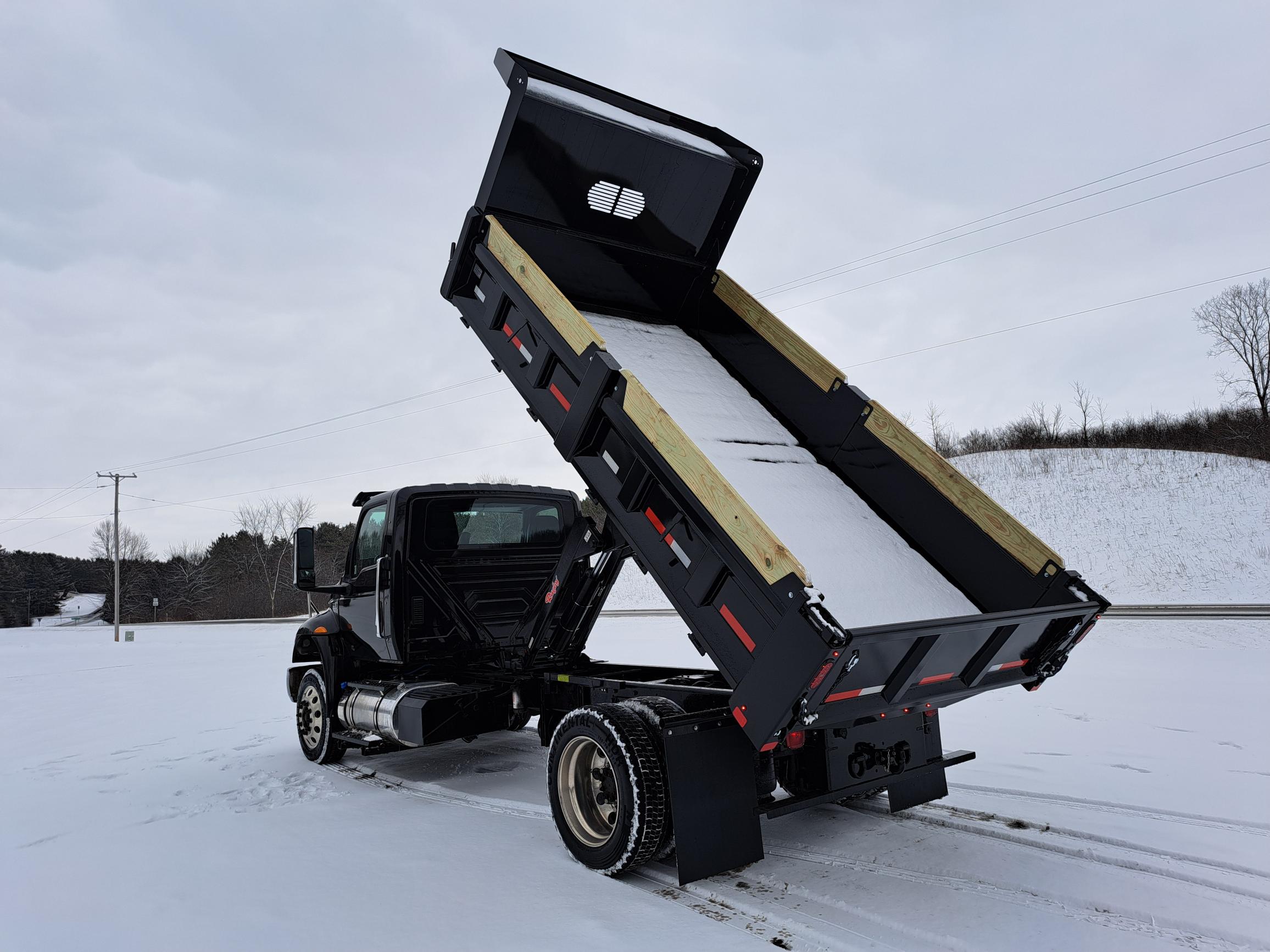 Non CDL 14FT Dump Truck – 18in Tip Down Sides – PTO powered Hydraulic Hoist – 3/4 pintle plate 20 Ton Hook – Cummins 6.7 250hp Engine – Allison 2500RDS Transmission – 10,000lb Front Axle – Air Ride – 70gal Fuel Tank – Aluminum Wheels